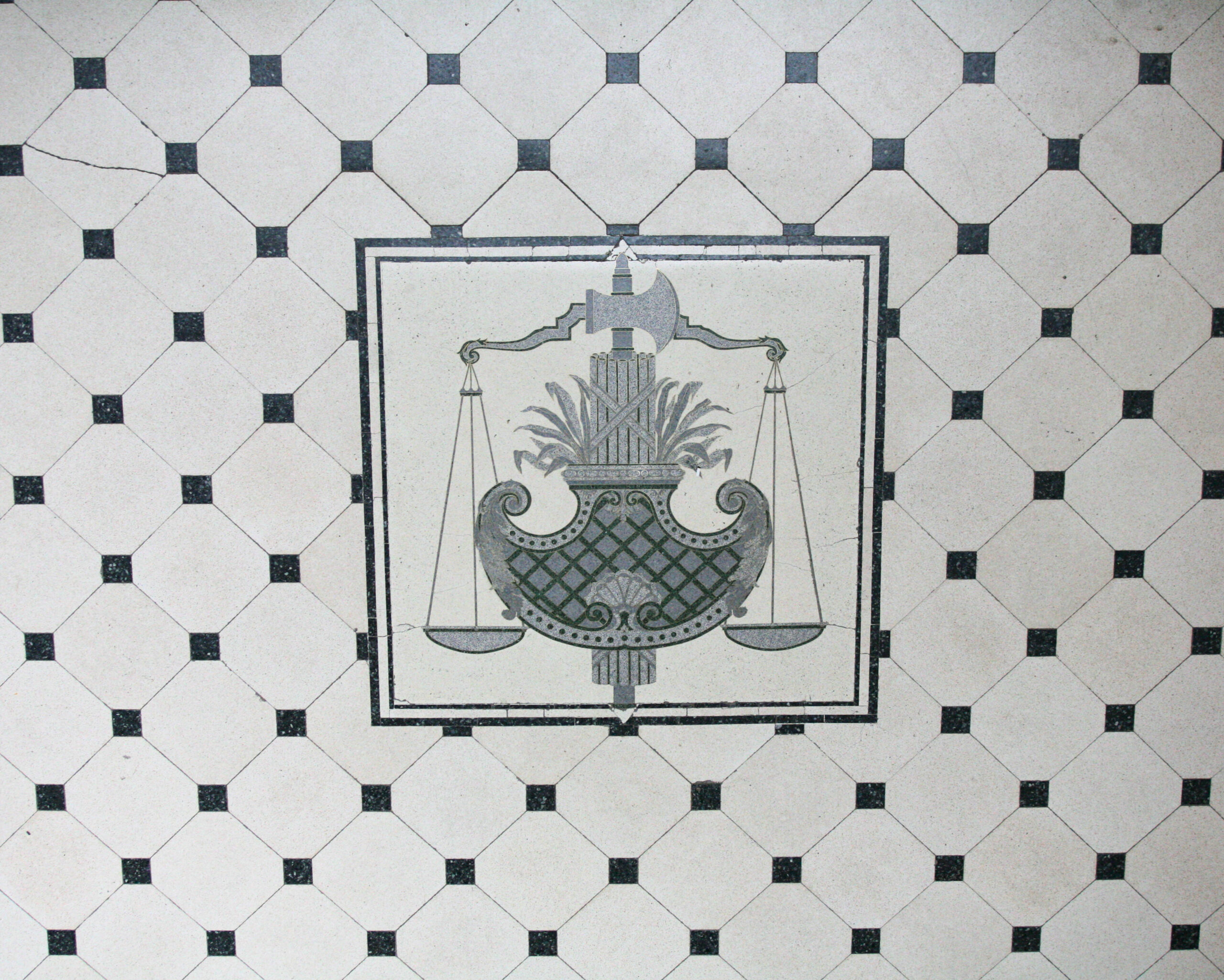 El plaquetario del Palacio de Tribunales es una obra artística realizada en mármol con la escultura de la balanza de la Justicia.