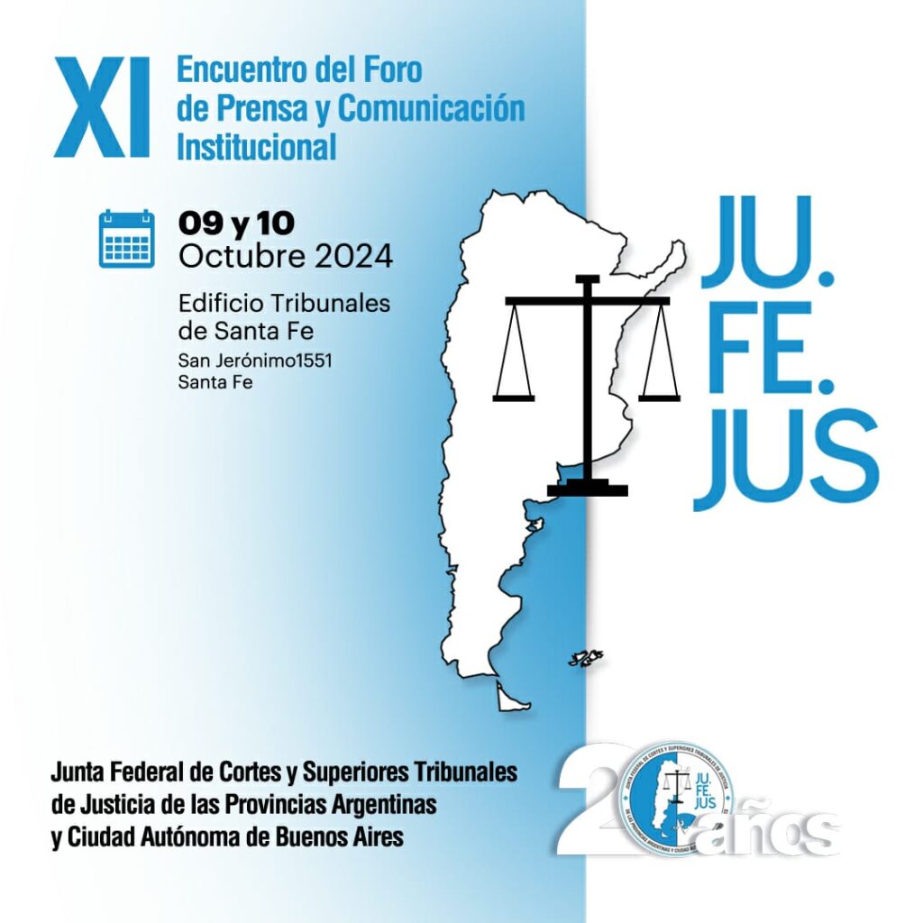 Este miércoles 9 y jueves 10 de octubre, Santa Fe será sede por primera vez del “XI encuentro del Foro de Prensa de JUFEJUS” que reúne a los responsables e integrantes de los equipos de prensa y comunicación de las Cortes y Superiores Tribunales de Justicia del país.
